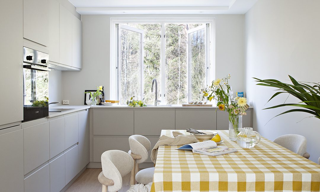 Lyse flater, åpne vinduer og en gjennomført palett danner rammen for en rolig og levende vårstemning hjemme hos Alett. Med fargen 5851 Kritt i Butinox Premium Matt har hun skapt et sømløst uttrykk der kjøkken og vegger går i ett.