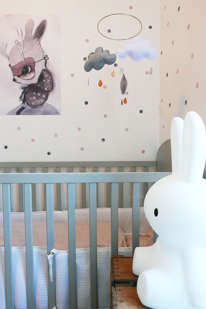 Den grå sengen skaper en kontrast mot de andre fargerike møblene i rommet (kommer senere i en annen post), og passer på balansen mellom fargerikt og rotete. Det blir fort mye plast på et barnerom, så en gammel trekasse er brukt som et nattbord. Den gir varme til kroken og er perfekt til oppbevaring av bøkene til den lille frøkna som bor her.