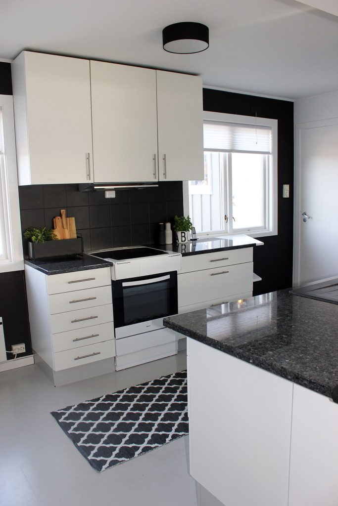 Er det ikke gøy å se? Hvor mye så lite kan gjøre? Her ser vi hvordan kjøkkenet så ut da de kjøpte huset for seks år siden. Her er det brukt de samme fargene som i spisestuen, klassisk hvit, mørk grå og lys grå for å holde en rød tråd gjennom hele huset. På før-bildet ser alt veldig slitt ut, også benkeplaten. Men ved å fornye alt som er rundt er den kommet til sin rett.