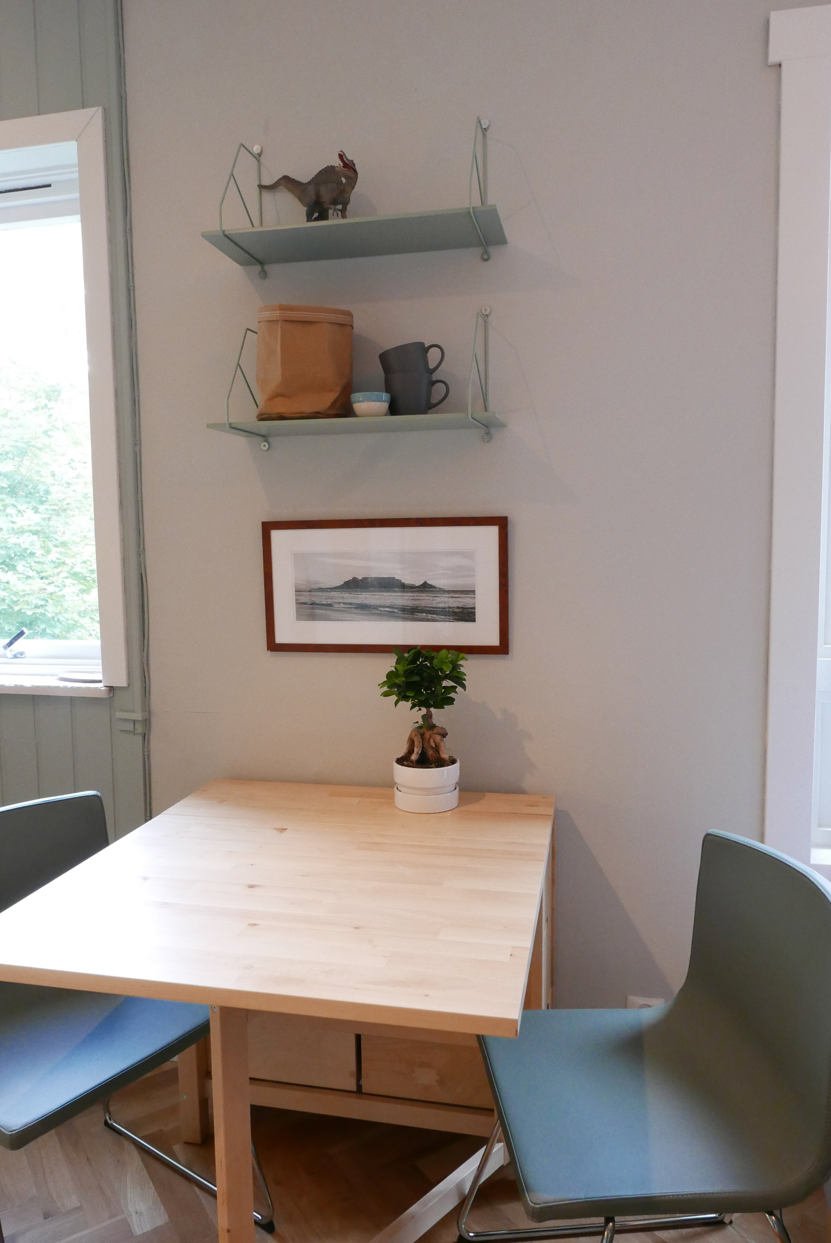 Hyllene er fra Søstrene Grene og passer perfekt til veggfargen på kjøkkenet!