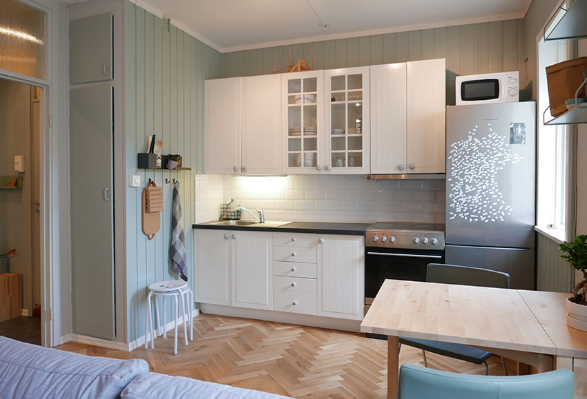 I utgangspunktet var alt malt hvitt, noe som ofte funker i små rom. Men her virket det ganske sjelløst, og Helge synes rommet var litt for «romantisk» for han. Den største endringen vi gjorde var å male veggene, men til gjengjeld gjorde det et stort utslag på følelsen av rommet! Rommet ble mer moderne og fikk en personlighet. På panelveggene rundt kjøkkeninnredningen er det malt med fargen 7163 Minty Breeze for å ramme inn kjøkkenet, og fordi det var et naturlig sted å starte fargen som skulle være i stuen. Så over kjøkkenbordet finner vi fargen 8470 Smooth White.