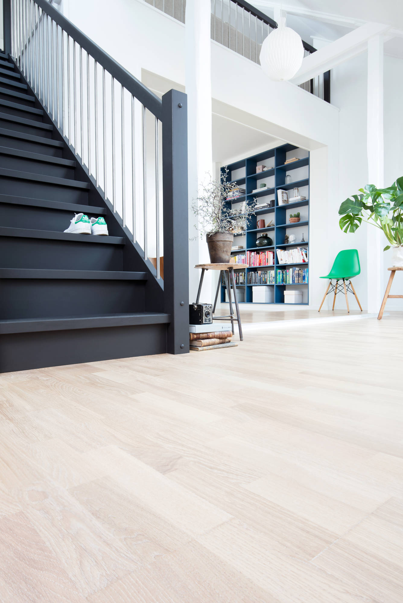 Men slik må det ikke være! Bare se på denne lekre trappen. Den har blitt en av stuens midtpunkter i en mørk og matt maling. Den mørke trappen er nå en fin kontrast til det lyse interiøret. Så i stedet for å gjemme trappen, framhev den til å bli en av alle de fine møblene i stuen.