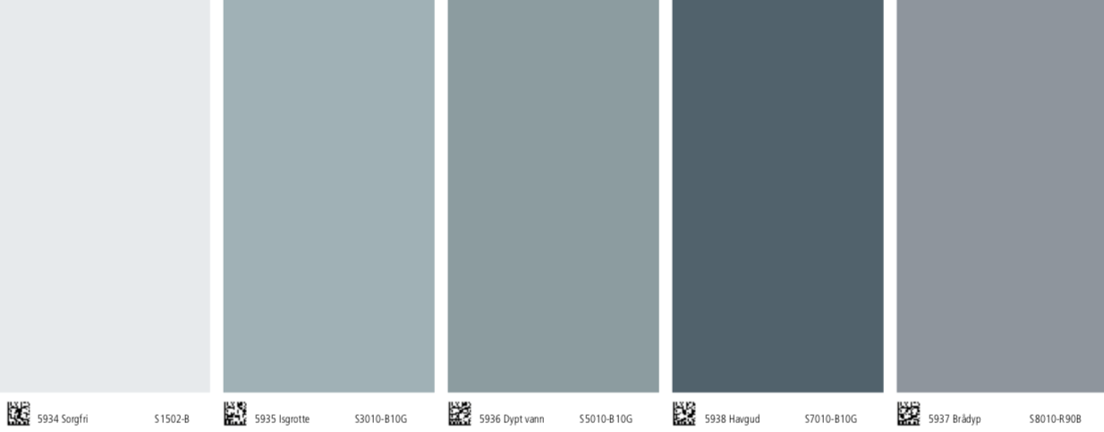 Veggfarge: NCS 2706-B74G Lister og møbler: NCS 2203-Y13R