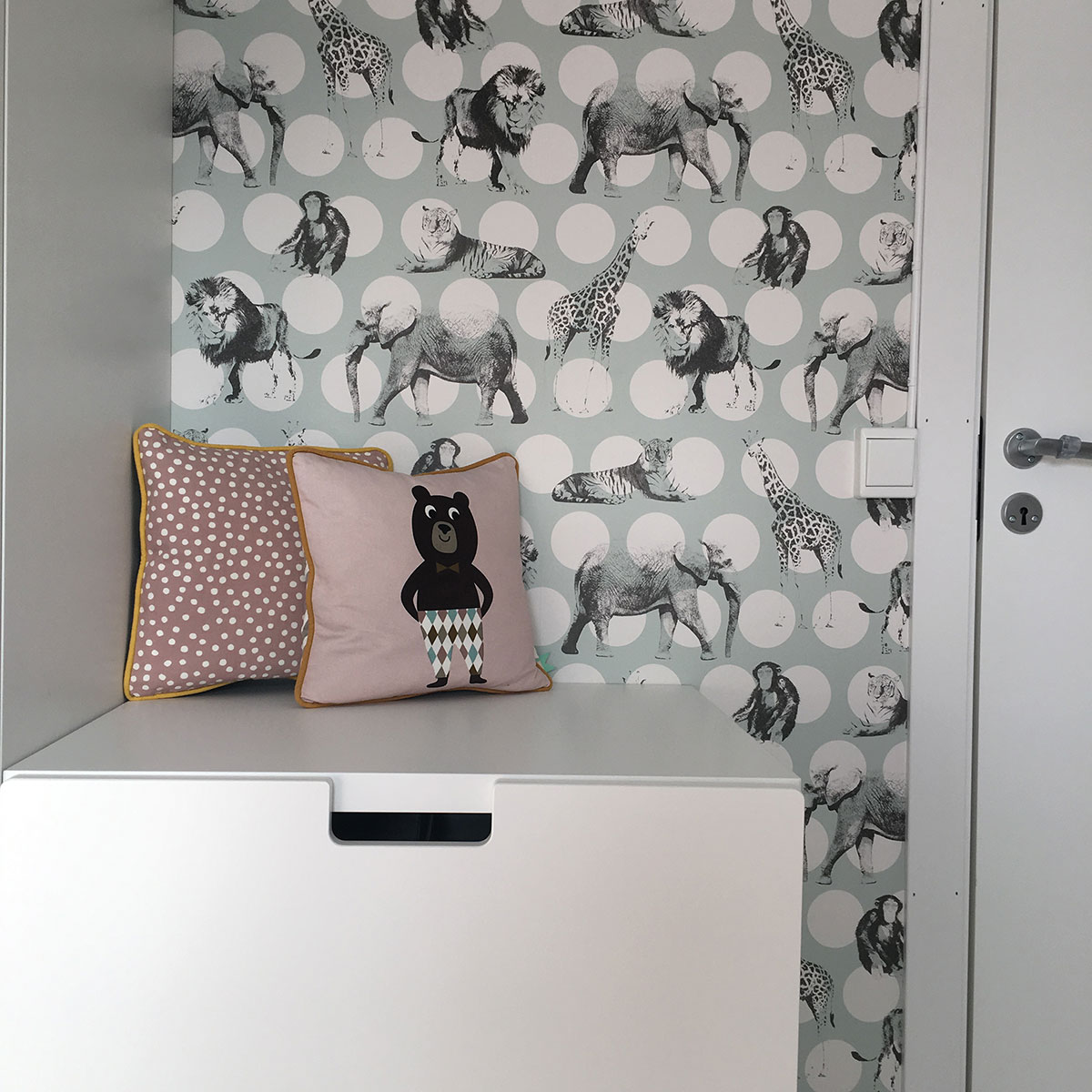 Hjemme hos Jannicke, i familiens 50-tallshus finner vi dette søte barnerommet. Rommet er innredet med klassiske møbler, leker og et gammelt vedlikeholdt tregulv i kombinasjon med en litt mer moderne og leken tapet. Dette rommet er lyst og luftig samtidig som det er noe spennende ved det! Tapetet skaper et lekent og barnslig uttrykk, men i kombinasjon med et malt gulv er det noe helt unikt med rommet. Med riktig kombinasjon av materialer kan man skape et spesielt uttrykk på soverommet uten å tilføre veldig mange farger.