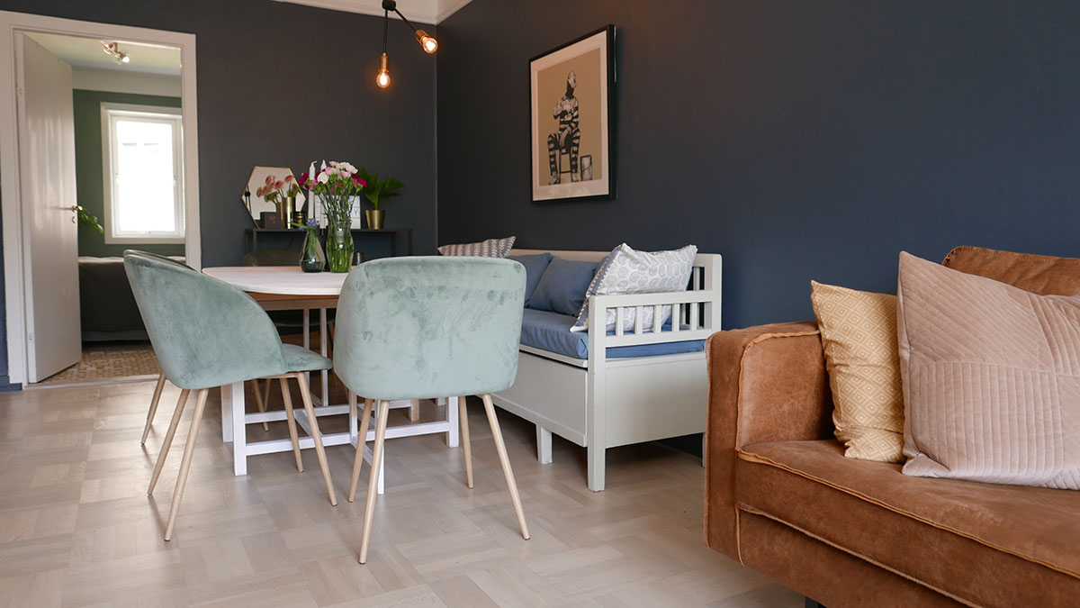 I Åshild nyoppussede spisestue valgte vi å fortsette med veggfargen fra stuen, og trekke den rundt i hele rommet. Den mørkeblå fargen har fargekode NCS S7010-R90B, og er malt med Butinox Elegant Matt.