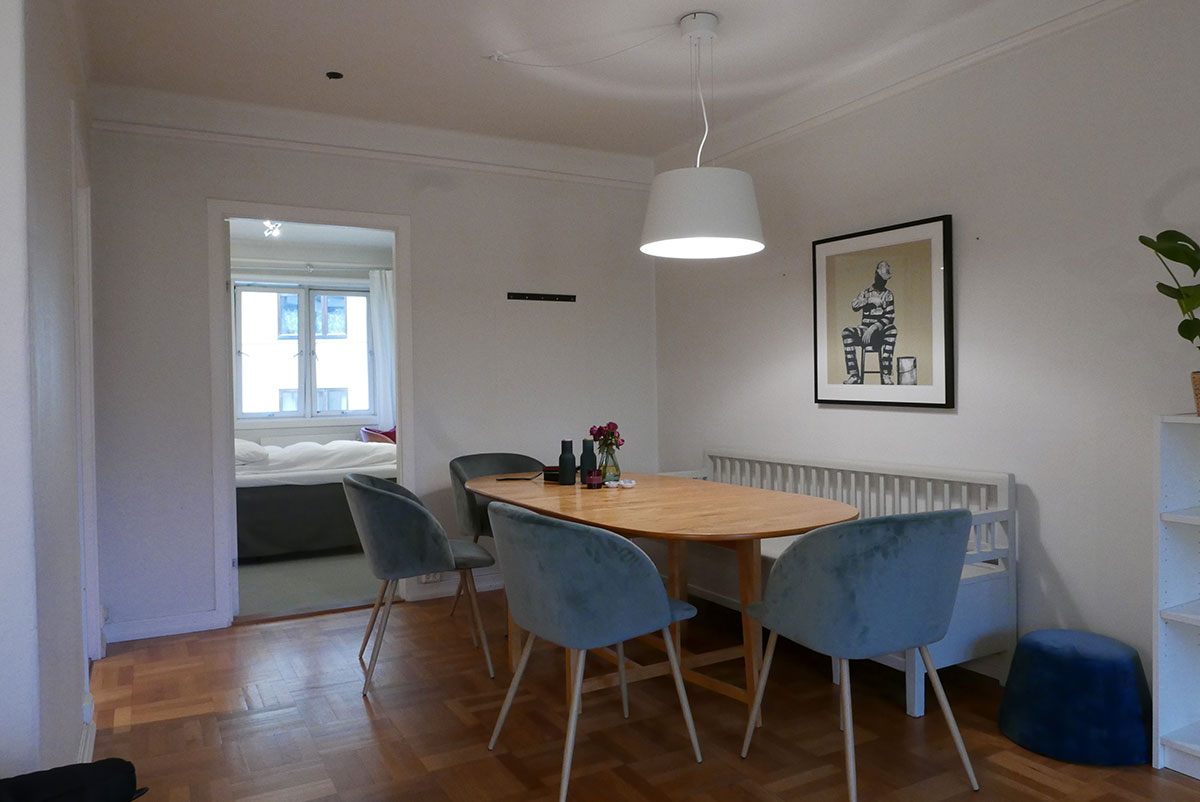Dette er spisestuen til Åshild på St. Hanshaugen, og slik så den ut før. Veggene var hvite, rommet var enkelt innredet, og gulv og spisebord har med årene gulnet. Med litt kjærlighet og maling ble rommet flunkende nytt!