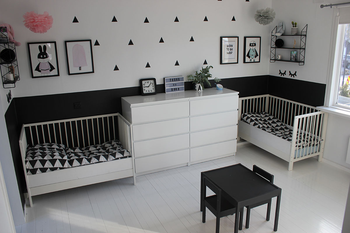 Nederst i saken kan du se hvordan soverommet så ut før. At endringen er stor er ikke til å stikke under en stol! De innebygde skapene er revet bort, og alle flater er frisket opp med maling. Hele rommet går i sort og hvitt med unntak av noen søte små detaljer rundt sengene, som skiller «jente-del» og «gutte-del». Og for at alt skulle henge sammen er også gulvet malt i den samme hvitfargen som veggene 5849 Brud, NCS 0401-G42Y. Gulvet er malt med TreStjerner Gulvmaling halvblank, som tåler barnas lek og er enkel å vaske.