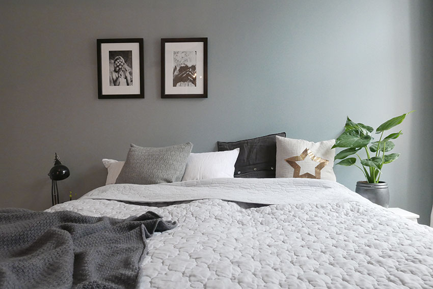 Sengeteppet er fra Ellos og passer perfekt til den Linblå veggen. Ser ut som et rom du kan sove godt i, ikke sant?