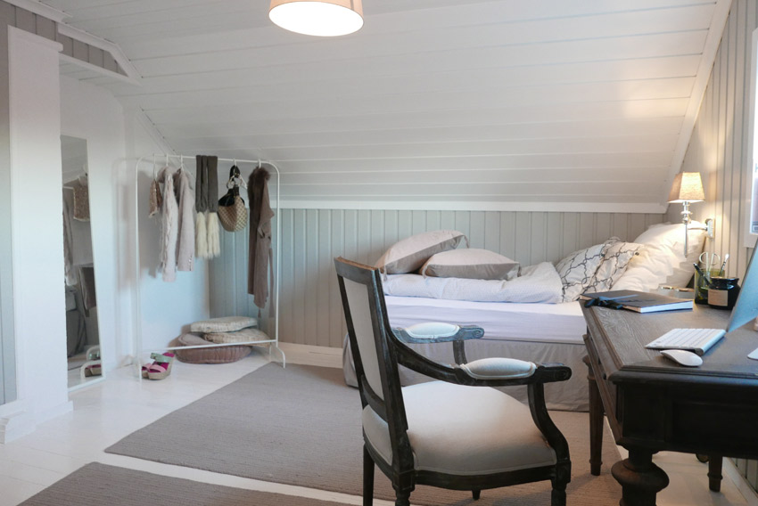 Dette loftet kan ved første øyekast se ut som et håpløst prosjekt, men da er det fint å huske på at alt kan males. Her er alt malt fra gulv til tak, nye møbler har fått plass, og både Svanhild og gjestene føler seg nå mer velkommen. Når kontoret har blitt så fint som dette er det ingen grunn til å ikke invitere gjestene inn her.