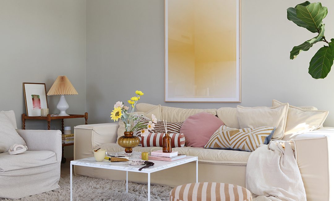 Nøytrale vegger gir uendelige muligheter, men det er først når man tilfører farger at rommet virkelig våkner til liv. I denne stua har veggene fått den varme gråbeige tonen 5852 Lys HAMP, og det danner en lun base for en fargepalett som både overrasker og begeistrer: smørgul, fersken, pudderrosa og konjakkfarget gulbrunt. Putene i sofaen er fra Eske Interiør, teppe fra Layered.