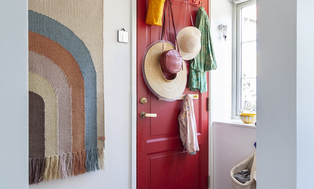 Familie betyr alt for Sarah og siden hun er nostalgisk har hun tatt utgangspunkt i farger og materialer som minner henne om sin egen barndom. – Gammeldagse sementfliser, rødfargen på døren og tekstiler på veggen er en del av dette. Jeg har også forsøkt å få til lekne detaljer som mine egne barn setter pris på som for eksempel regnbuen, fuglehus nøkkelholder og kaninkurver til oppbevaring, som også er praktiske i en travel småbarnsfamilies hverdag, forteller hun.