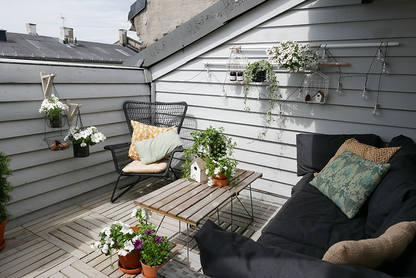 Fra å være en enkelt innredet terrasse med en minimalistisk stil, har dette utviklet seg til å bli enn innbydende plass man gjerne slapper av med en god bok, eller i selskap med gode venner. Det er ikke flere møbler her nå enn før, men mer dekorasjon og varmere farger på tekstilene.